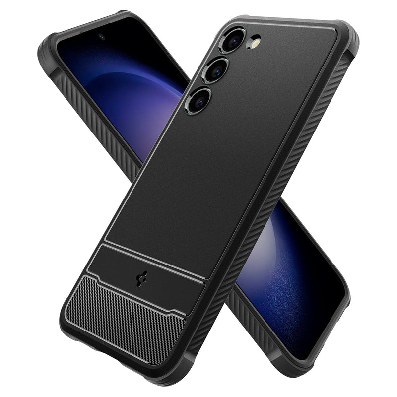 Rugged refined. Spigen Rugged Amor celebrates a decade of protection with an all-new design for your Galaxy S23 Series. Bolstered with extra bumper protection on all corners, yet drives home a modern and sleek profile with its carbon fiber detailing. Always be ready to pack a punch.