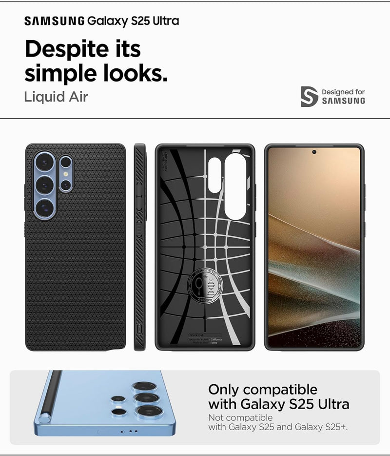 Go with the flow. Spigen Liquid Air case brings a refreshing look to your new Galaxy S25 Ultra. Its geometric design provides protection and grip at all angles. Feel comfortable holding your device without all the extra bulk. The perfect grip meets the right amount of drip.