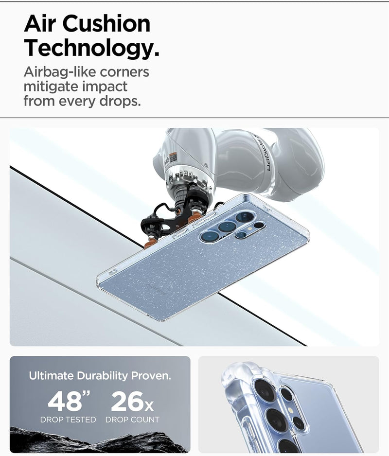 Shining. Shimmering. Protected. Spigen Liquid Crystal Glitter case for Galaxy S25 Ultra streamlines a whole new dimension to your Galaxy phone. Its form-fitting design keeps everyday dings and scratches away. Wherever you go, always behold the splendid style of your Galaxy.