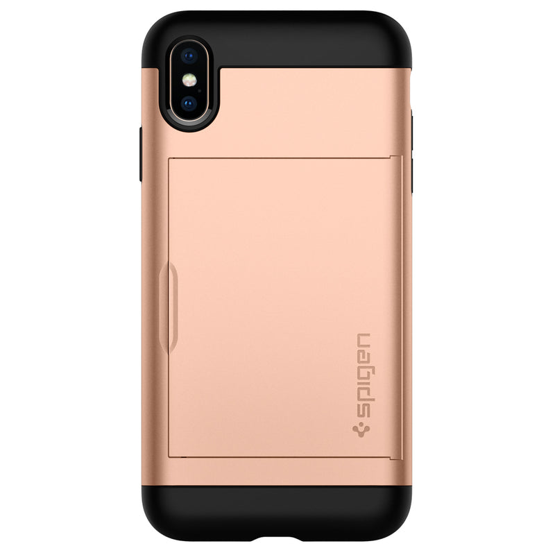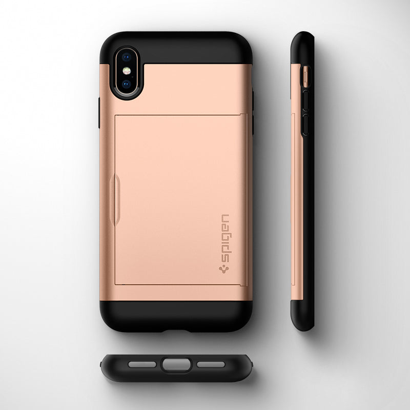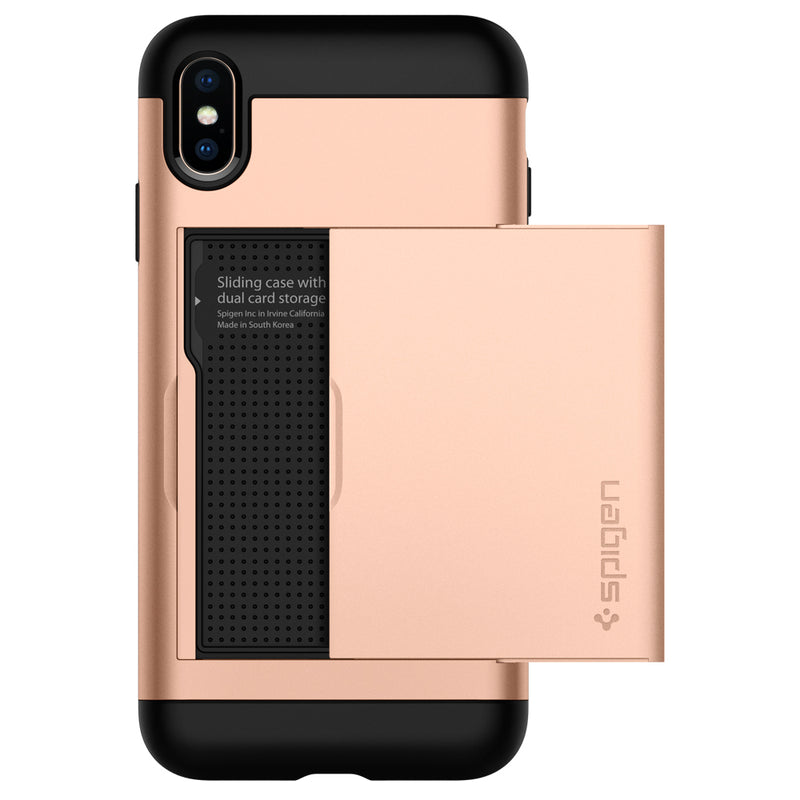 The Spigen Slim Armor® CS for the new iPhone XS Max combines extreme defense with on-the-go storage. Designed to be slim and pocket-friendly, the dual-layer structure is built with Air Cushion Technology® packed into every corner for bolstered drop-defense. The back slides open for easy access to a pocket of storage for a wad of cash or some cards. Even with all of the extra protection, the case remains thin and easy to grip. Encase your new iPhone XS Max in the practical yet rugged Slim Armor® CS. *Remove all cards during wireless charging