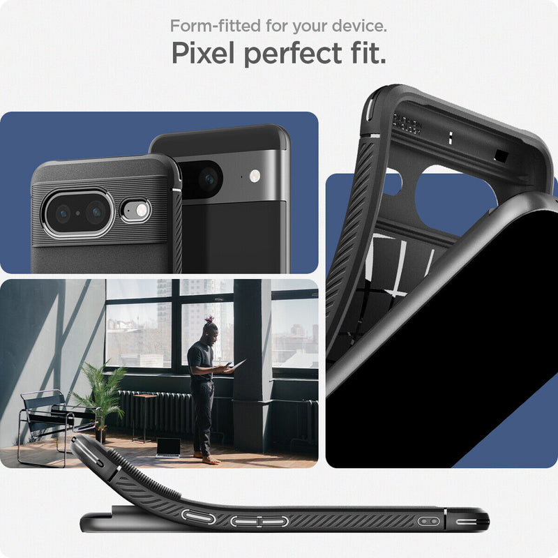 Rugged refined. Spigen Rugged Amor case celebrates a decade of protection with a classic design for your Pixel 8. Tried and true, its modern and sleek carbon fiber detailing is built to take a punch. Be ready to take on the daily beat.