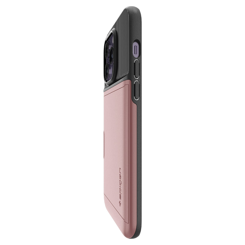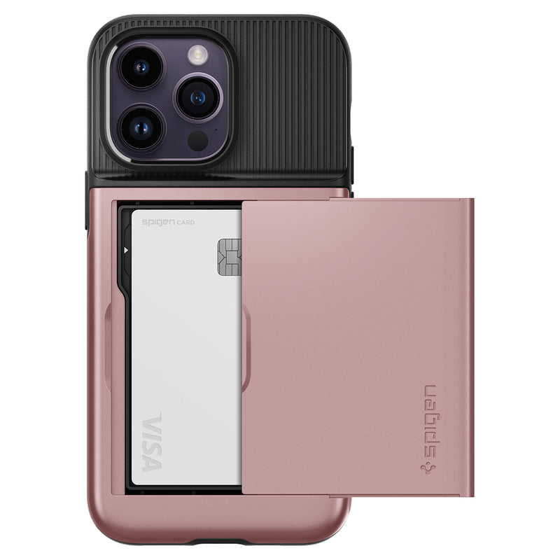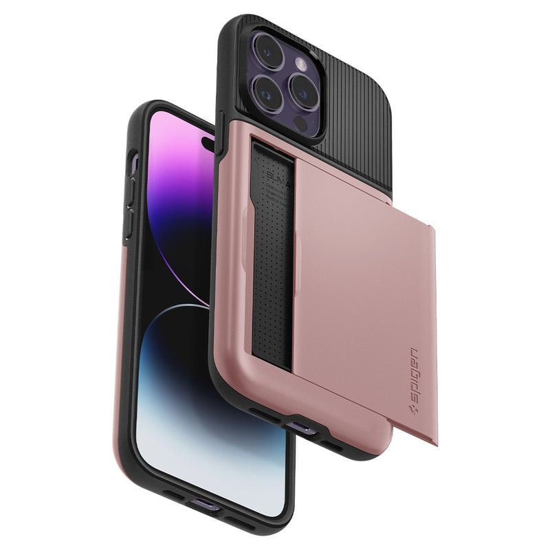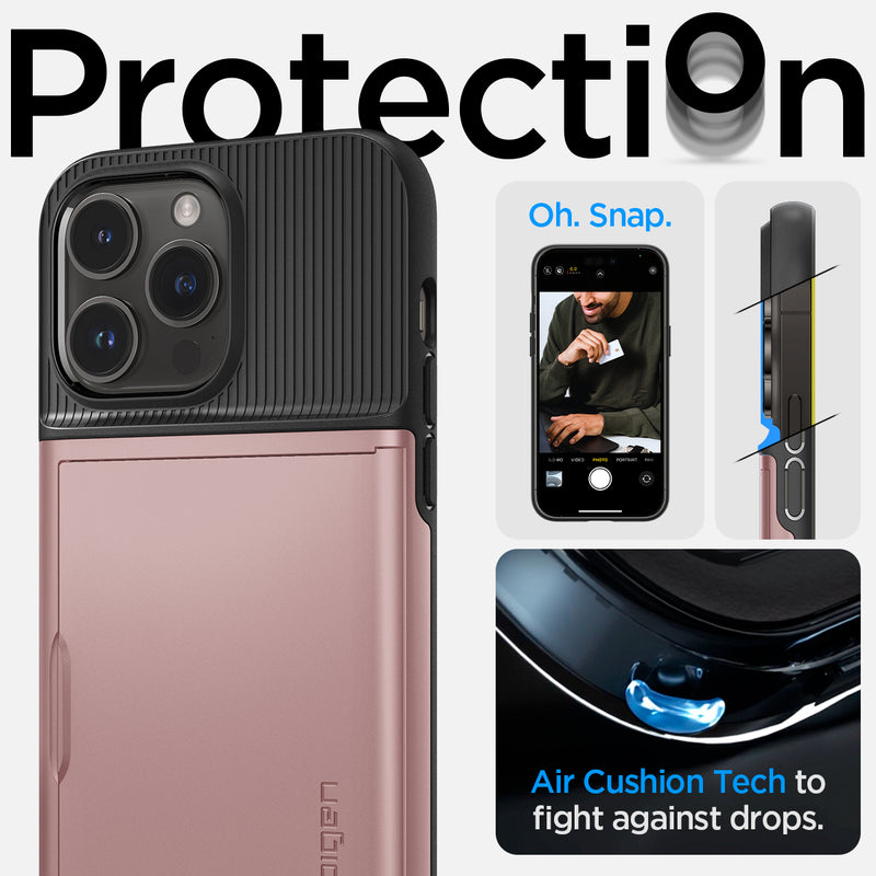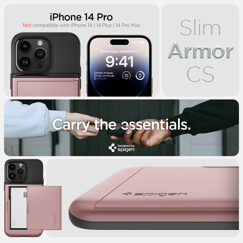 Expand your pocket real estate. Slim Armor CS makes your iPhone 14 Pro the only thing you need to carry. Its sturdy built-in wallet secures up to two cards and your phone from drops. Make the smart move and drop the bulky wallet. We got you.