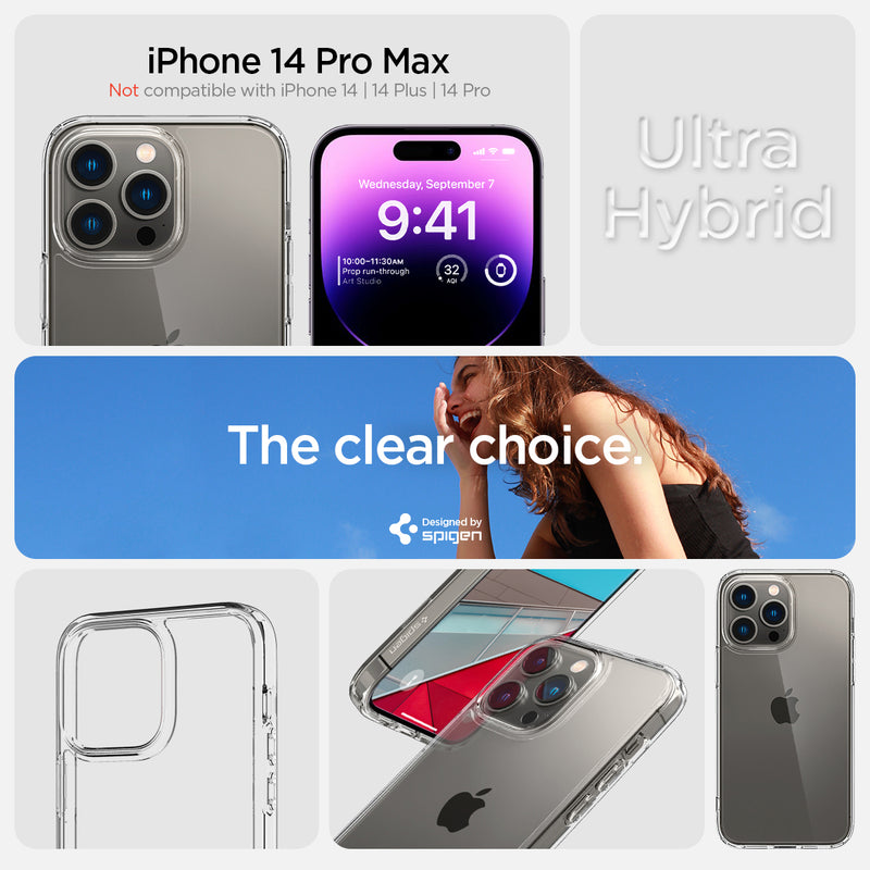 The clear choice. Spigen Ultra Hybrid case for iPhone 14 Pro Max shows off your iPhone’s far-out design. Never let the minimalist dream end with daily protection that keeps you in the clear from drops and scratches. Do you. We got you covered.