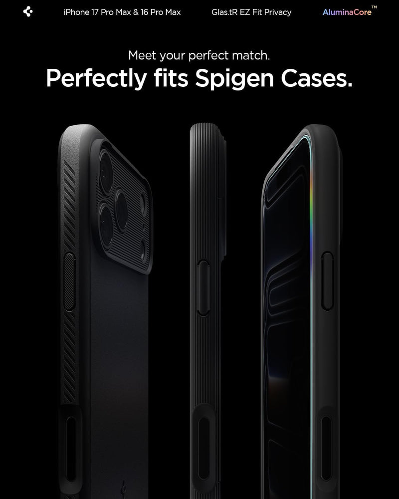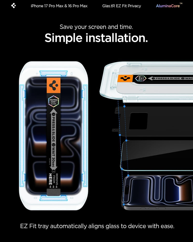 Be a hero. Save your screen and your time. Spigen EZ Fit lets you install a screen protector on your iPhone 17 Pro Max / iPhone 16 Pro Max display like never before. Use the tray to align the screen protector on your iPhone, press down, and you’re good to go. Easy does it.