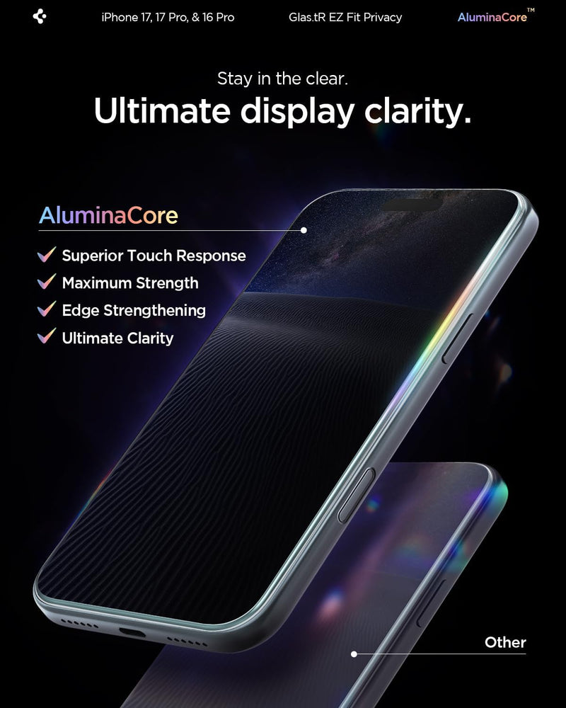Be a hero. Save your screen and your time. Spigen EZ Fit lets you install a screen protector on your iPhone 17 / iPhone 17 Pro and iPhone 16 Pro's display like never before. Use the tray to align the screen protector on your iPhone, press down, and you’re good to go. Easy does it.